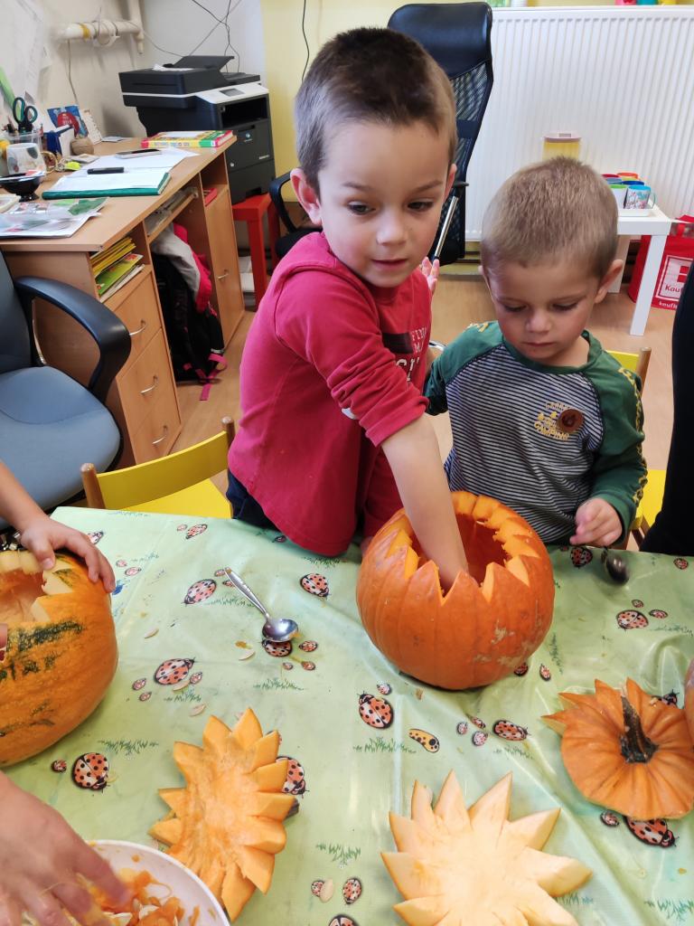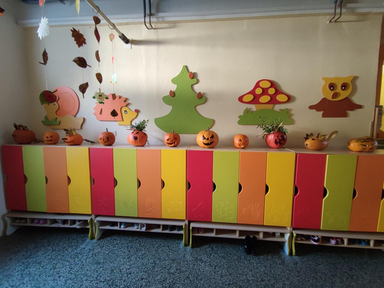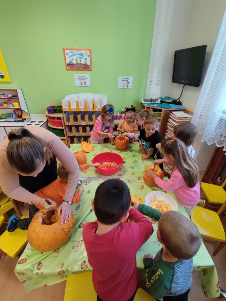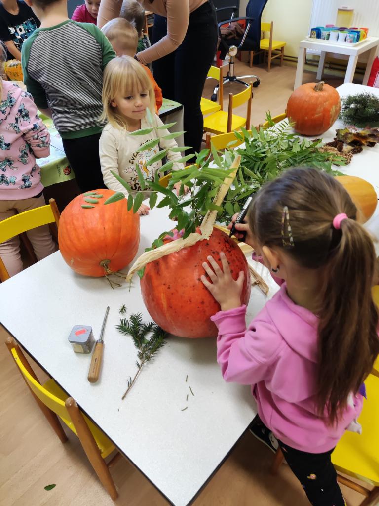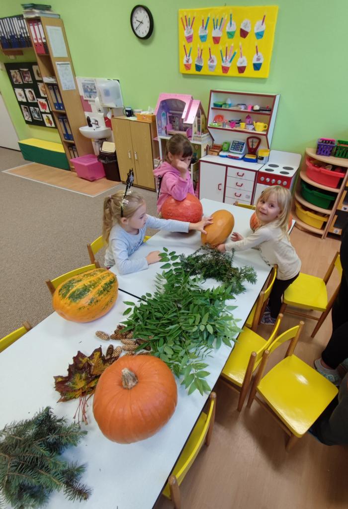 Děti si vytvořily dýňáky vyřezávané a nebo jen ozdobené různými přírodninami, které zdobí naši školku.