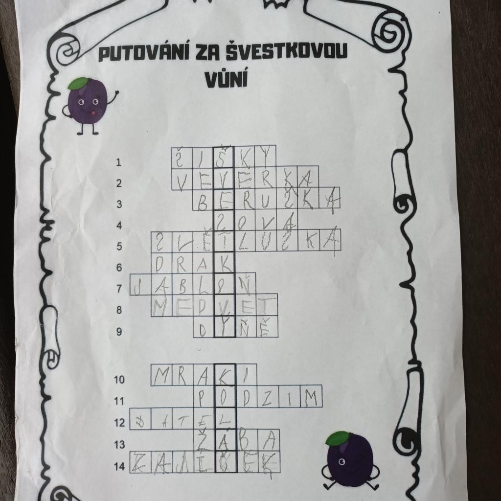 Stezku „Putování za švestkovou vůní“ připravila pro děti z MŠ paní učitelka Vodičková. Dětem z družiny se moc líbilo, když viděly, že po splnění všech úkolů, kterých bylo dohromady 14, byly děti z MŠ odměněny krásným dárkovým balíčkem a řekly si, že když zvládly stezku „školčátka“, že se nedají zahanbit, rozdělily se na dvě družstva „DOBRODRUZI“ a „GANGSTEŘI“ a pustily se s chutí a zdravou rivalitou do plnění úkolů.