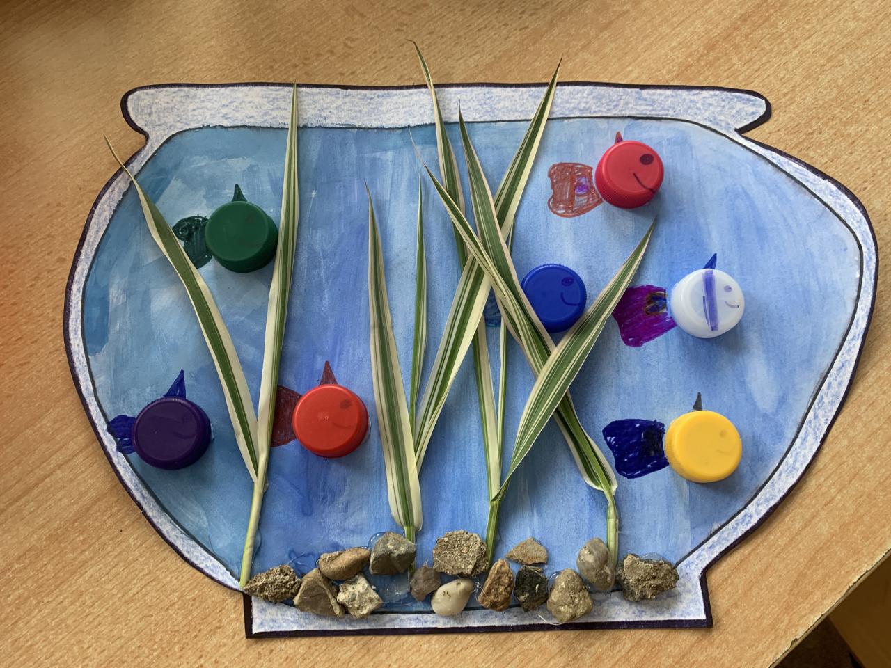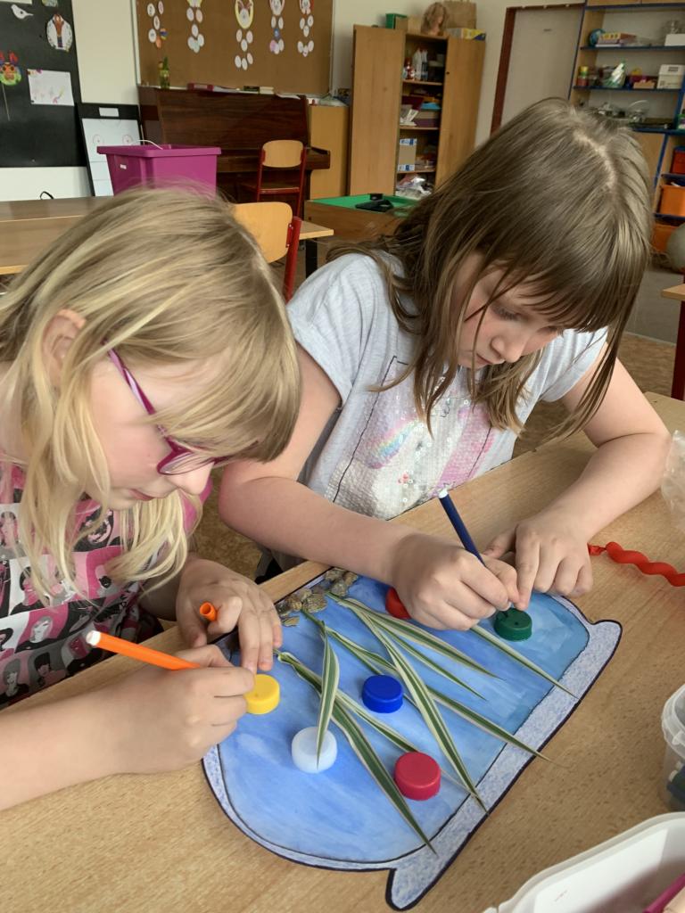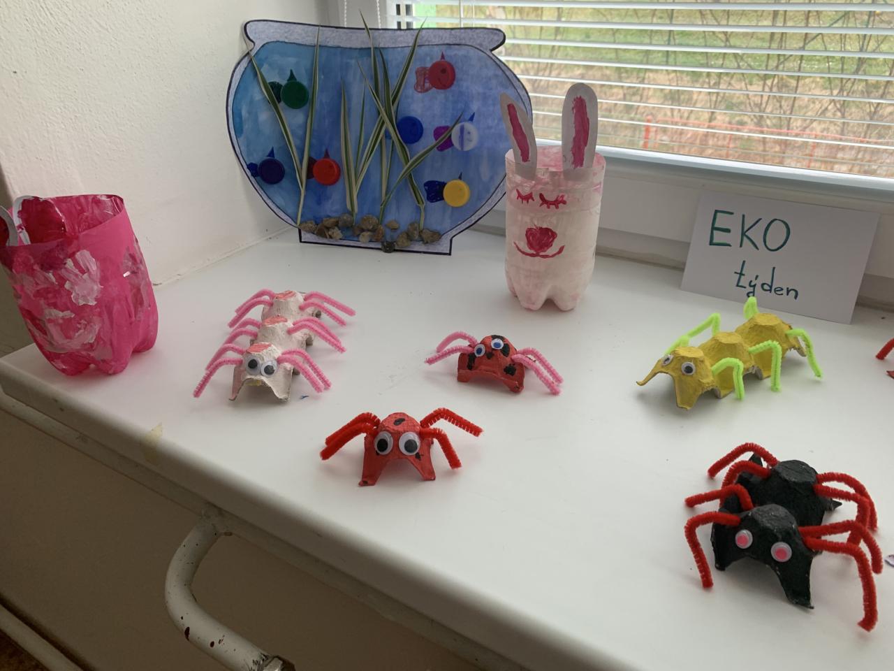 Tyto dny jsme využívali různé odpadní materiály k vyrábění praktických předmětů a dekorací. Vytvořili jsme si dekorace ze skla, stojánek na tužky z plastové PET lahve nebo například akvárium s rybičkami.