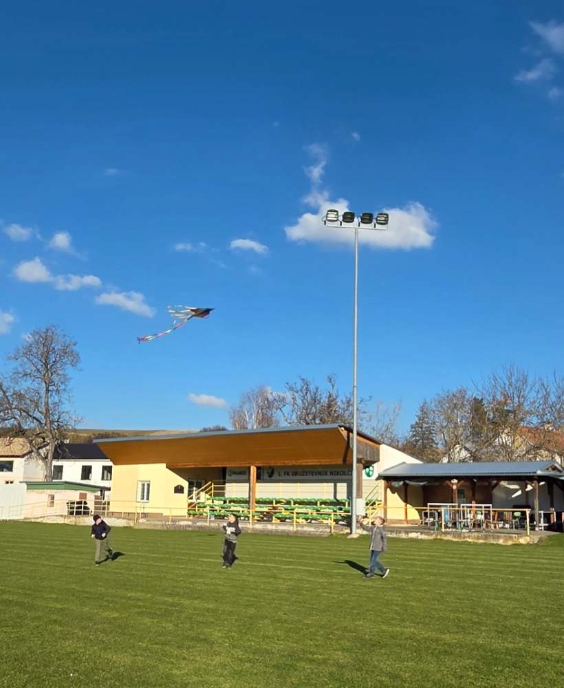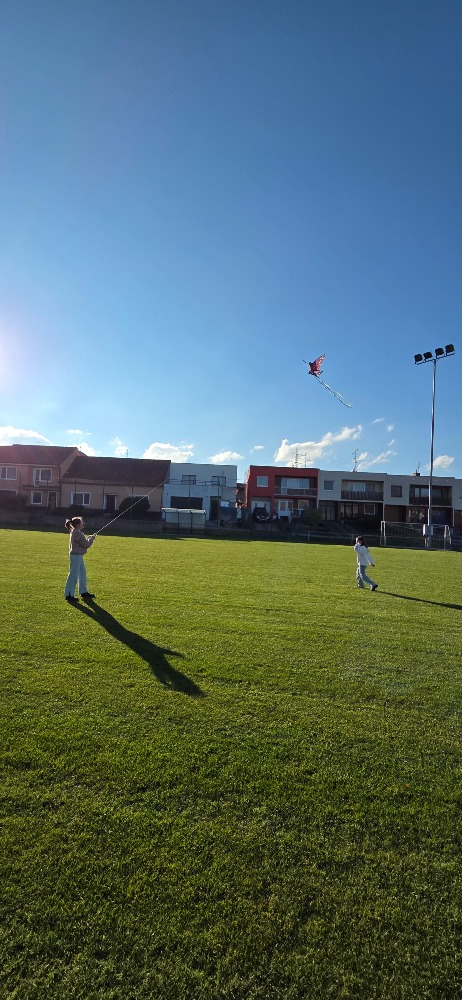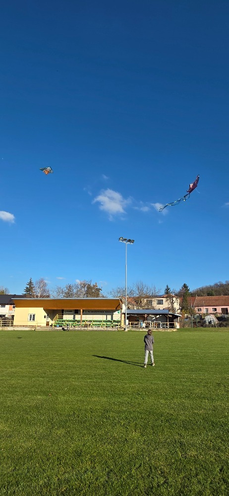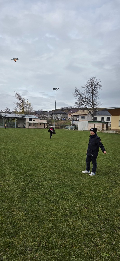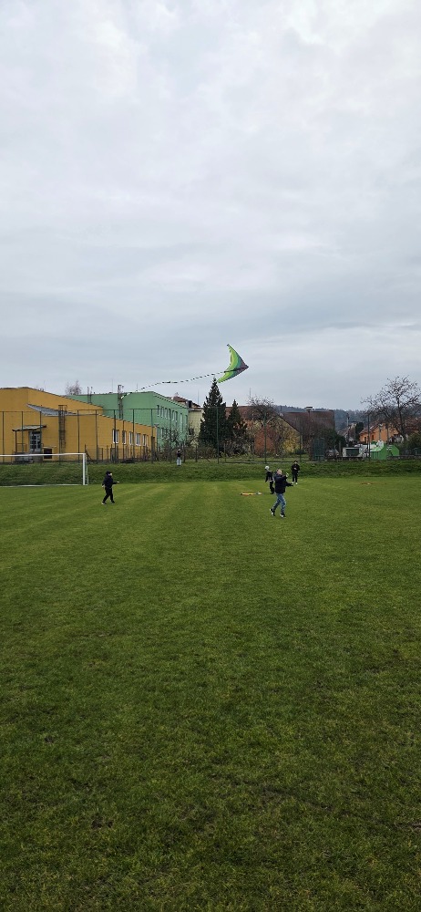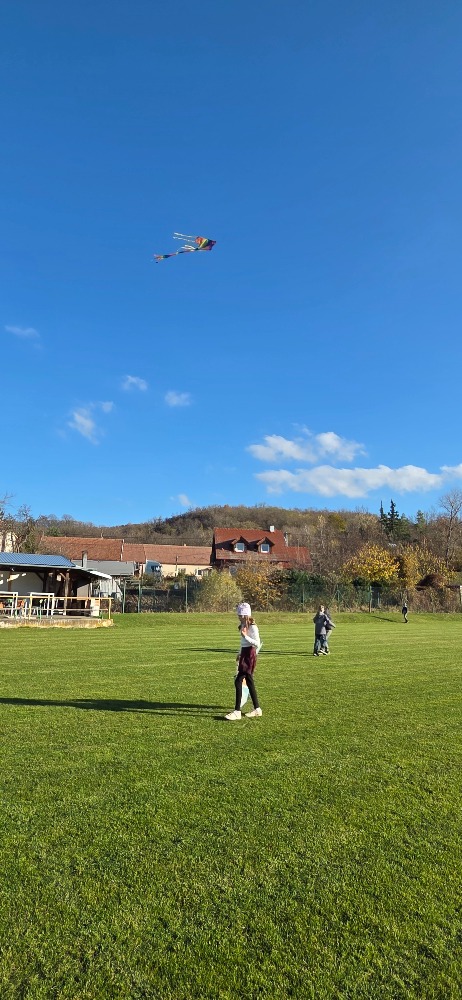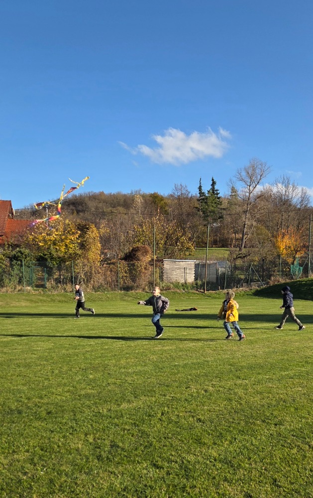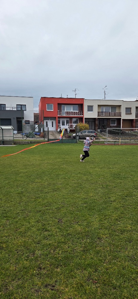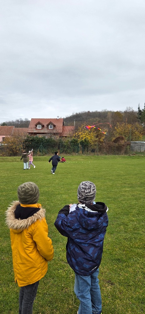 Děti si na hřišti pouštěly draky, které si přinesly z domu.
