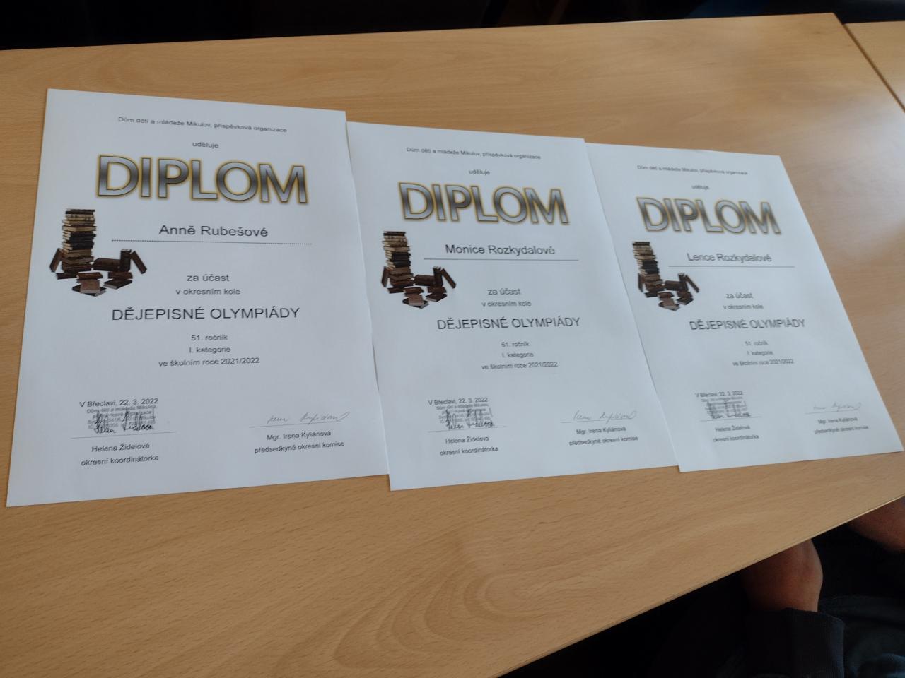 Dne 22.3. 2022 se zúčastnily Monika Rozkydalová , Lenka Rozkydalová a Anna Rubešová v Břeclavi okresního kola soutěže z dějepisu se zaměřením Šlechta od konce raného středověku do roku 1648. Soutěžilo asi 45 žáků. Děvčata dobře reprezentovala naši školu.Mgr. Květoslava Charvátová