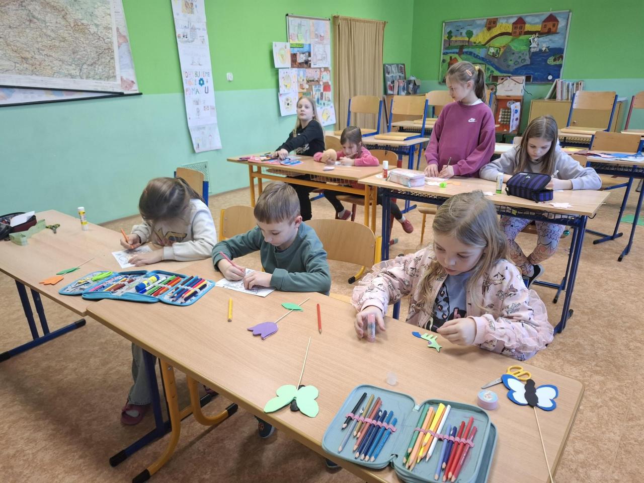 V pondělí 3. 3. žáci vytvářeli jarní zápichy do květináče (kytičky, motýlky, ptáčky).
